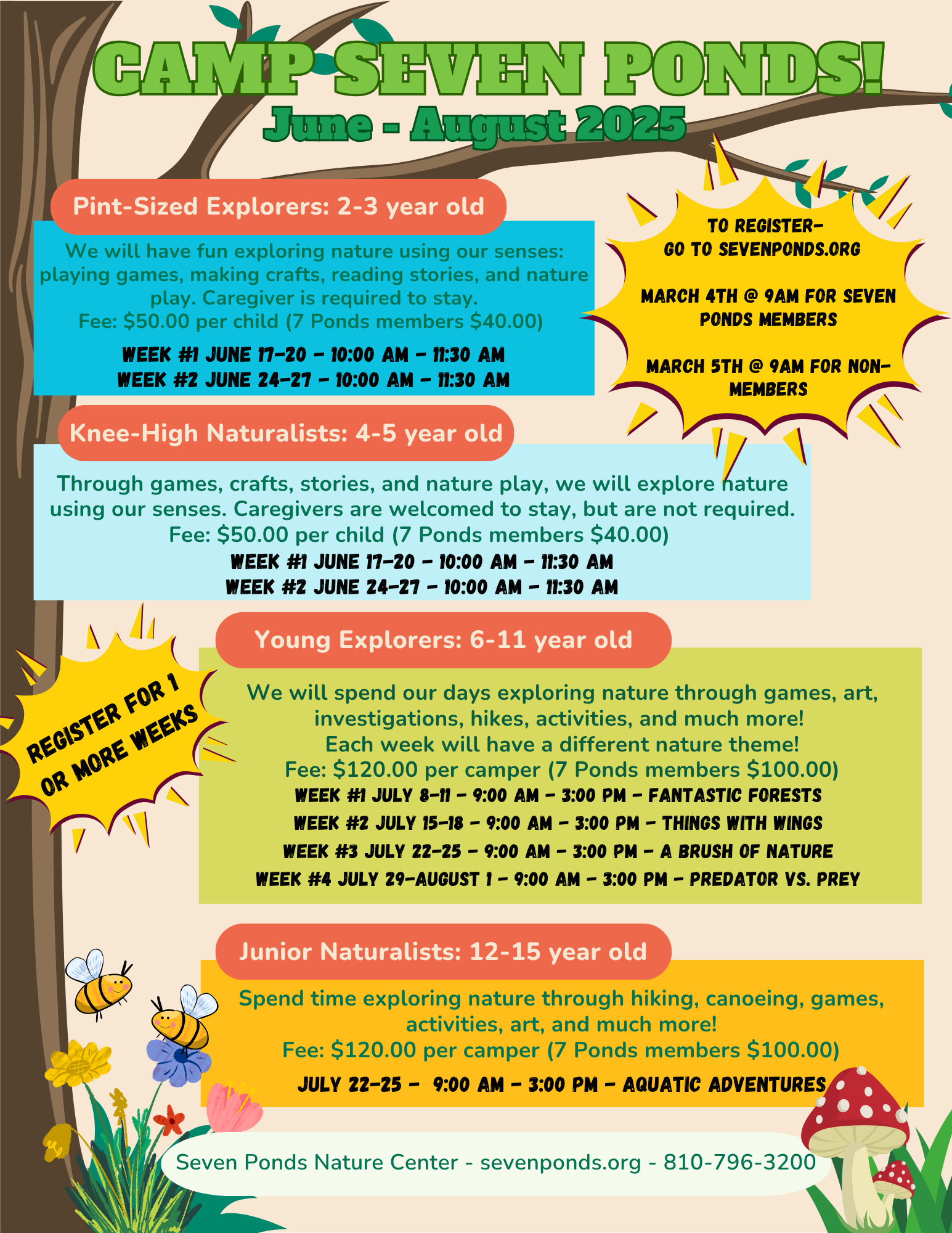 Registration for Camp Seven Ponds! opens Tuesday, March 4th at 9:00 am for Seven Ponds members and Wednesday, March 5th at 9:00 am for non-members.