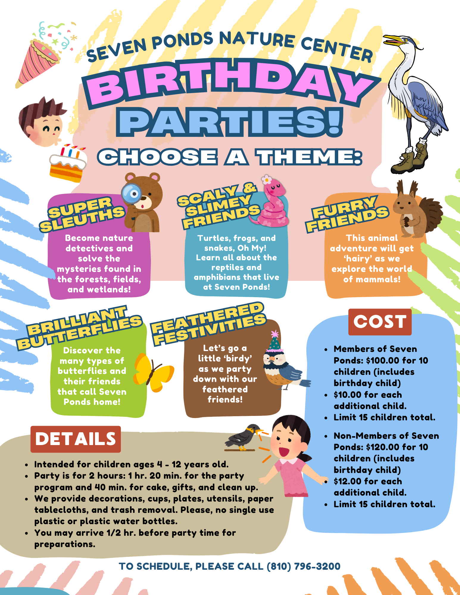 To schedule a birthday party, contact Seven Ponds at (810)796-3200