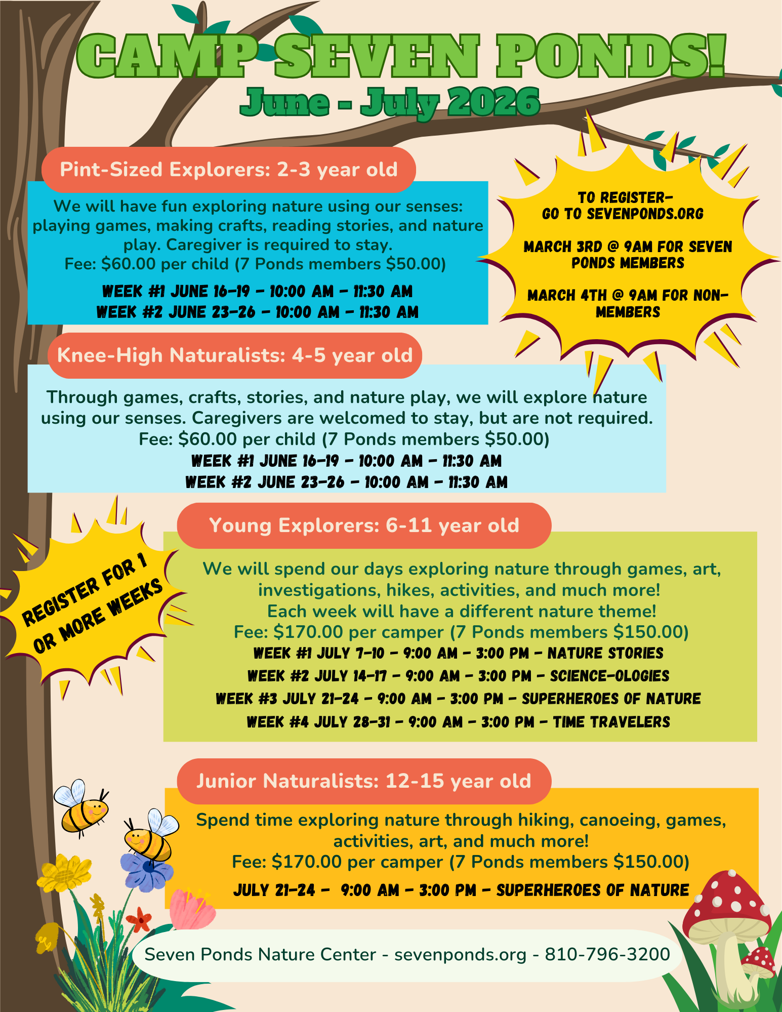 If camp is full, please contact the nature center to be put on a wait list (810-796-3200).