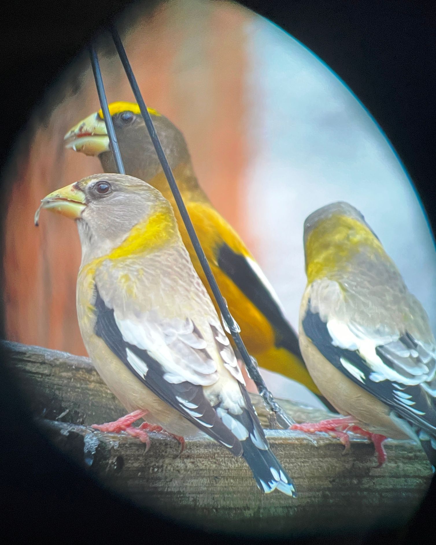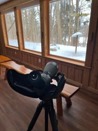 A male and female Evening Grosbeak seen in profile through the nature center's scope