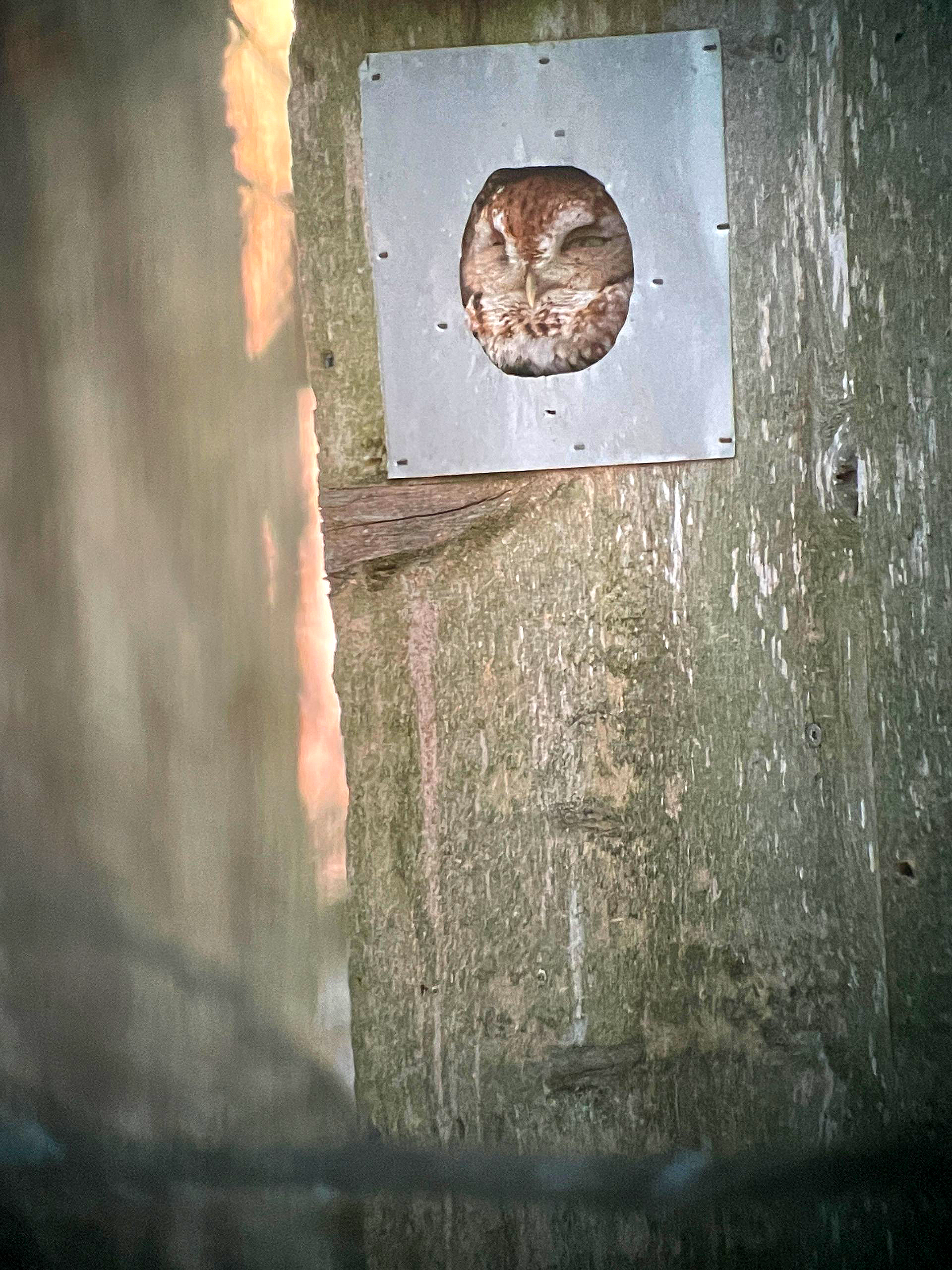 A sleepy-eyed red-form Eastern Screech-Owl utilizing one of our nest boxes.
